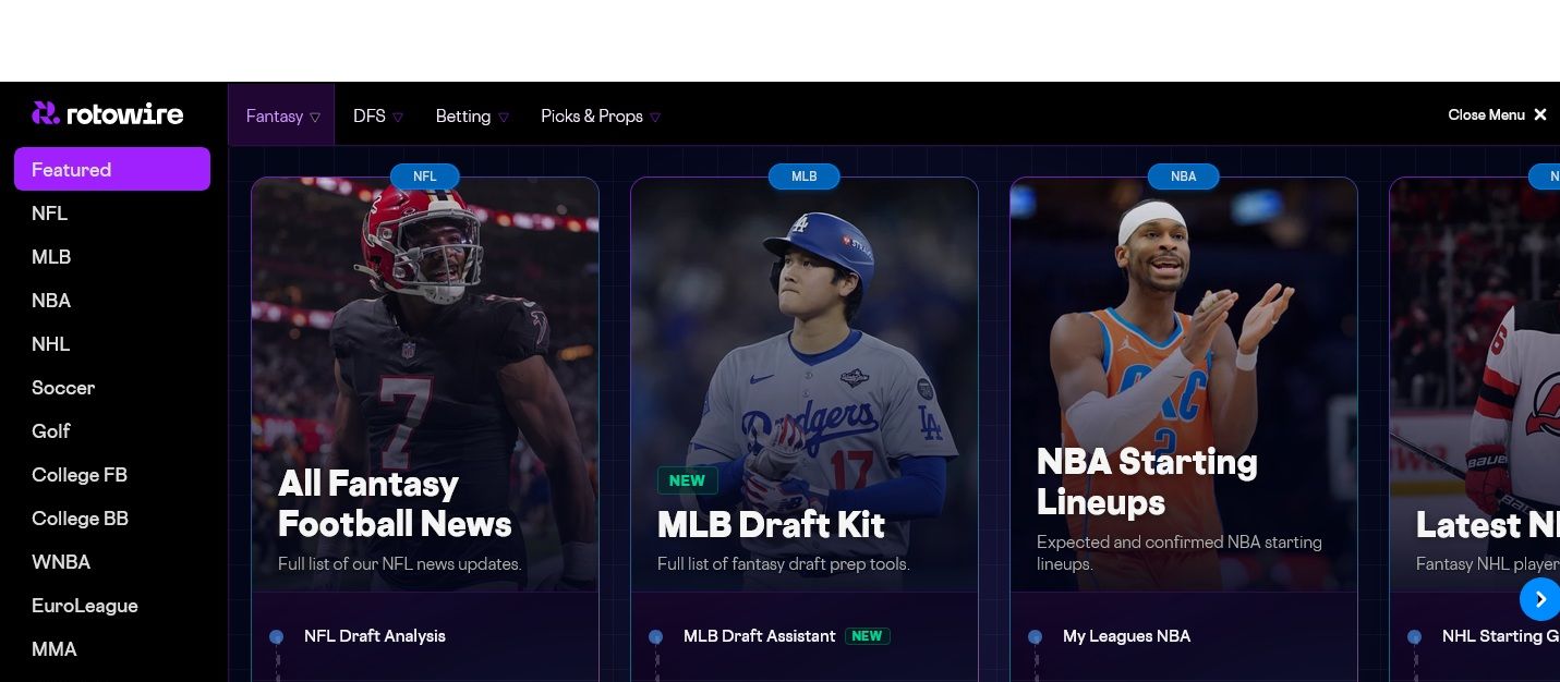 You can also search in the upper right of each section for a page or tool and quickly find it. The "My Leagues" area of each sport also gives you quick access to the leagues you have uploaded into our excellent tool for managing your teams. The navigation takes over the full page, but you can quickly close the navigation with a "Close Menu" button in the upper right or by clicking on the top navigation area again.