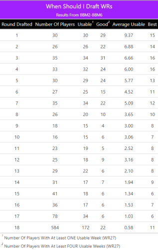 The usable average stays pretty flat from the third round through the seventh rounds before tapering off to where you're aiming for about three usable weeks from each receiver you take from there on.