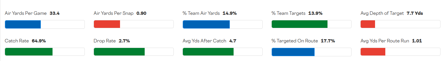 Ayomanor goes a bit later than Dike and is equally deserving of being on your radar. While he didn't rate well in some areas -- a 46% catch rate is admittedly bad, as is a 5.8 YPT on 89 targets -- there are elements to Ayomanor's profile that are promising. He has a downfield role (12.1 aDot) and skill set, and he commanded a high percentage of the team's air yards (28.4%, 84th percentile) while also maintaining a strong TPRR% (19.4).